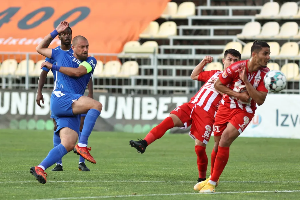 Meciul de fotbal dintre echipele FC Voluntari (echipament albastru) si UTA Arad (echipament alb/rosu) din etapa a 9-a a play-out-ului Ligii 1, disputat pe stadionul Anghel Iordanescu din Voluntari, miercurie 19 mai 2021. GEORGE FILIP / MEDIAFAX FOTO