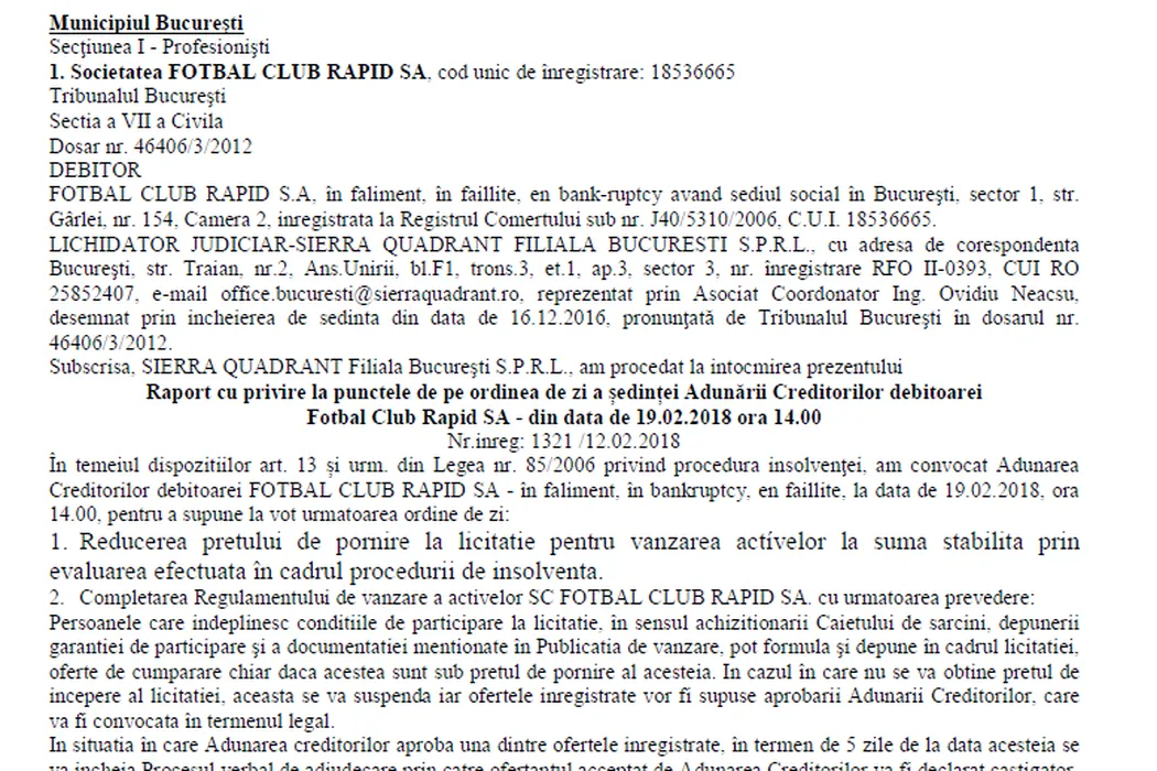 Șansele ca marca Rapid să se vândă au crescut simțitor după ce creditorii au schimbat condițiile de licitație. Suma minimă a fost coborâtă de aproape 10 ori. Important: Primăria Sectorului 1 NU a prevăzut în 2018 bani pentru fotbal