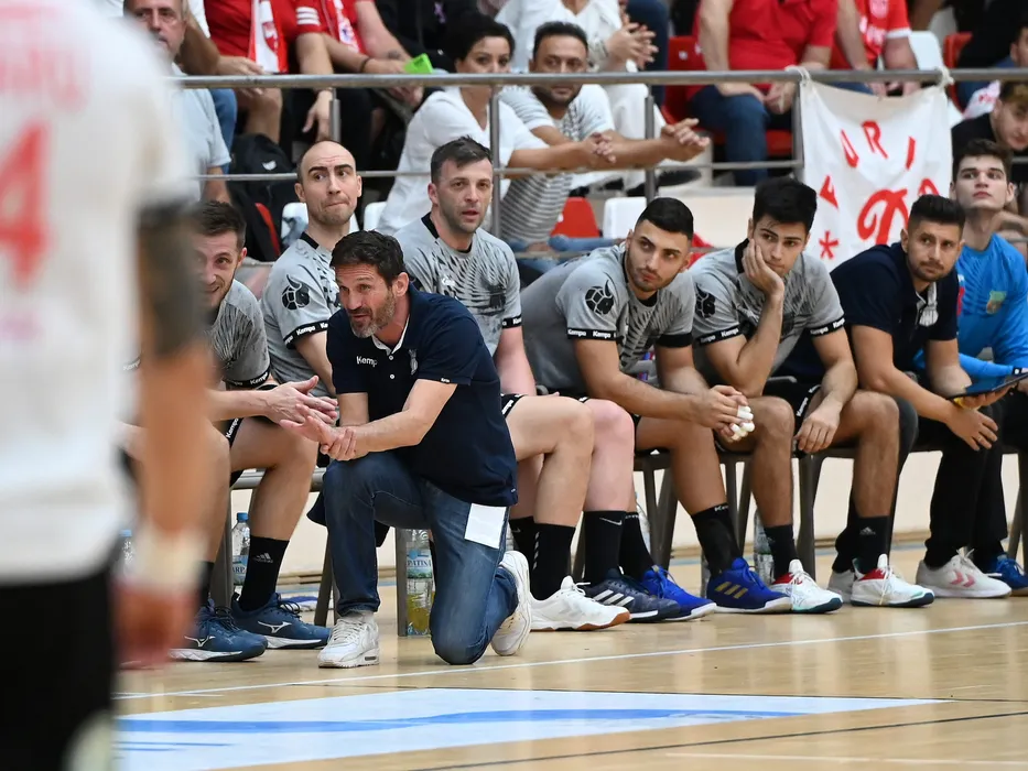 Stephan Plantin reactioneaza alaturi de banca stelista in meciul de handbal masculin dintre Dinamo Bucuresti si Steaua Bucuresti, contand pentru Liga Zimbrilor, desfasurat in Sala Dinamo din Bucuresti, vineri 6 octombrie 2023. © FOTO:Razvan Pasarica/SPORT PICTURES