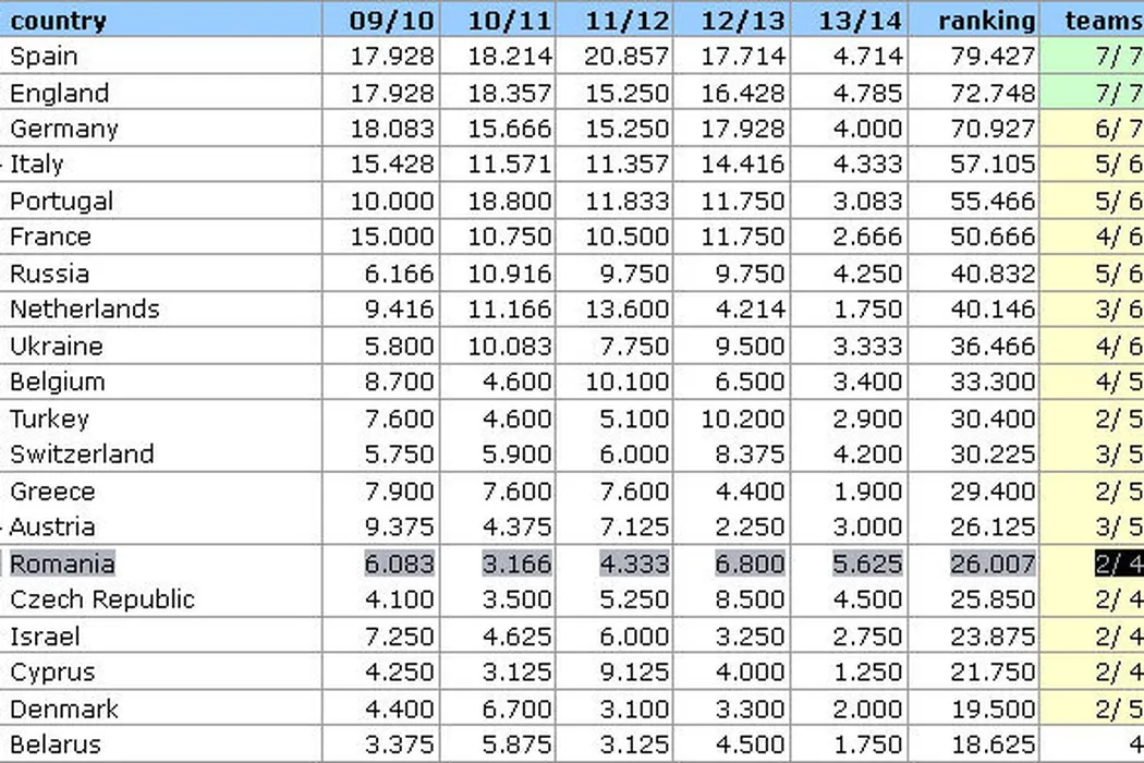 Săptămână neagră pentru coeficientul României! Eșecurile Stelei și Pandurilor ne-au dus pe locul 15