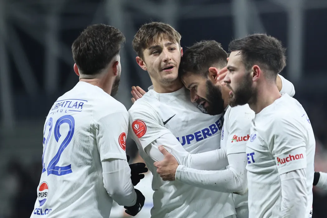 Fotbalistii constanteni se bucura dupa un gol marcat de Bogdan Ionut Tiru in meciul de fotbal dintre Dinamo Bucuresti si Farul Constanta, contand pentru SuperLiga Superbet, desfasurat pe Stadionul Arcul de Triumf din Bucuresti,sambata 15 februarie 2025. © FOTO: Gheorghe Fluster/SPORT PICTURES