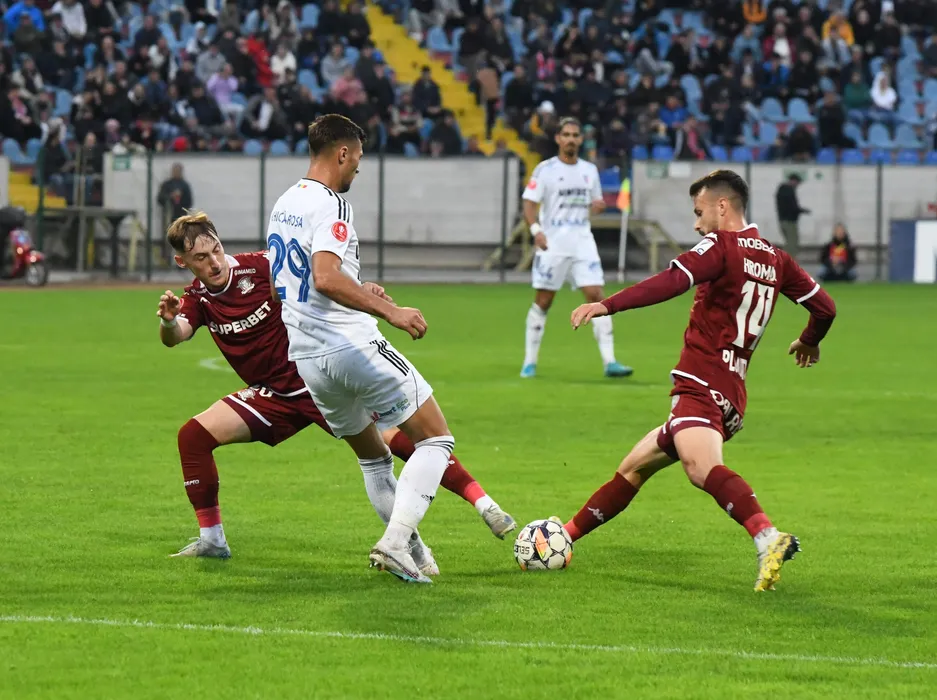 Adi Marian Chică Roșă și Constantin Grameni, Jakub Hromada în meciul de fotbal dintre FC Botoșani și PFC Rapid 1923 București, contând pentru Superliga Superbet, desfășurat pe Stadionul Municipal din Botoșani, duminică 6 octombrie 2024. © FOTO: Tudi/SPORT PICTURES