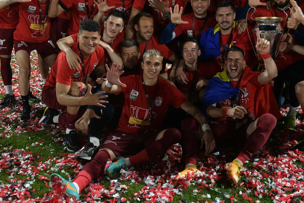 Bucurie clujeana cu Jefferson Yuri De Sousa Matias, Cristian Marian Manea si Constantin Adrian Paun dupa castigarea campionatului in urma meciului de fotbal dintre CFR Cluj si Universitatea Craiova, contand pentru Play-off-ul Ligii 1 Casa Pariurilor, desfasurat pe Stadionul CFR Dr. Constantin Radulescu din Cluj Napoca, duminica 15 mai 2022. © FOTO:Razvan Pasarica/SPORT PICTURES