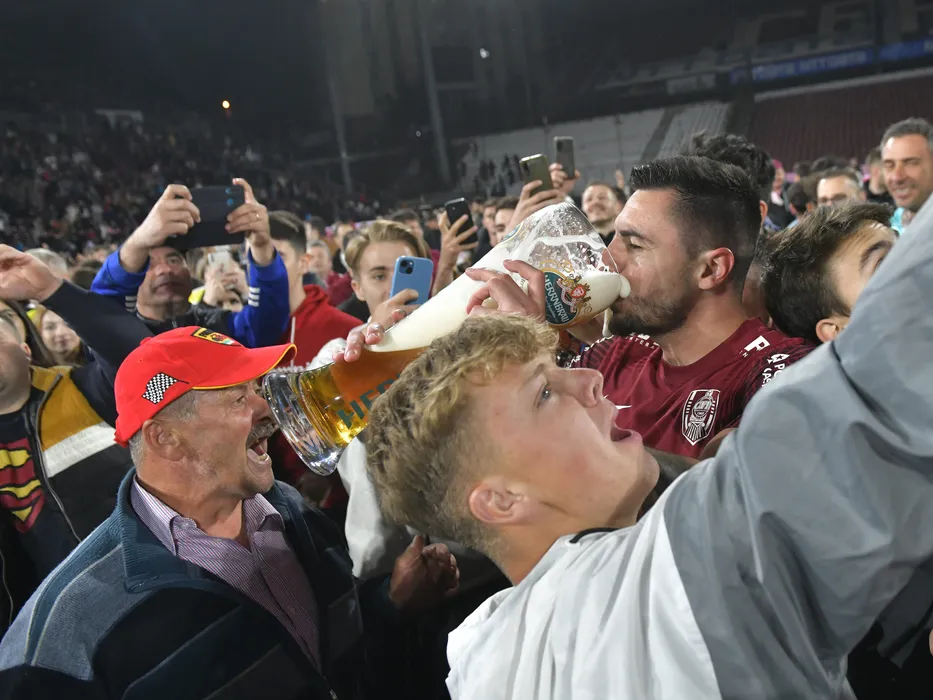 Bucurie clujeana cu Andonie Andrei Burca dupa castigarea campionatului in urma meciului de fotbal dintre CFR Cluj si Universitatea Craiova, contand pentru Play-off-ul Ligii 1 Casa Pariurilor, desfasurat pe Stadionul CFR Dr. Constantin Radulescu din Cluj Napoca, duminica 15 mai 2022. © FOTO:Razvan Pasarica/SPORT PICTURES