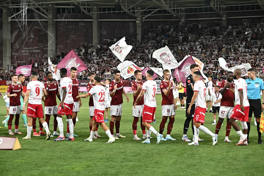 Fotbalistii celor doua echipe se saluta inaintea meciului de fotbal dintre Rapid Bucuresti si Dinamo Bucuresti, din cadrul Superligii Superbet, desfasurat pe Superbet Arena-Giulesti din Bucuresti, duminica 18 august 2024. © FOTO:Razvan Pasarica/SPORT PICTURES