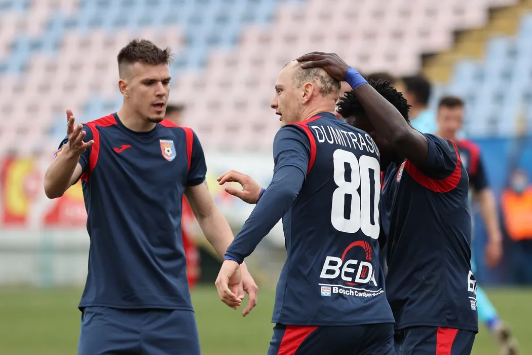 Fotbalistii targovisteni se bucura dupa un gol marcat in meciul de fotbal dintre Chindia Targoviste si Hermanstadt, contand pentru Liga a-1-a Casa Pariurilor, desfasurat fara spectatori pe Stadionul Gloria din Buzau, sambata 17 aprilie 2021. © FOTO:Gheorghe Fluster/SPORT PICTURES