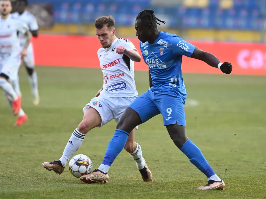 Martin Christophe Y Remacle si Godberg Barry Cooper in meciul de fotbal dintre Chindia Targoviste si Universitatea Cluj, contand pentru Superliga Superbet, desfasurat pe Stadionul Ilie Oana din Ploiesti, vineri 17 februarie 2023. © FOTO:Razvan Pasarica/SPORT PICTURES