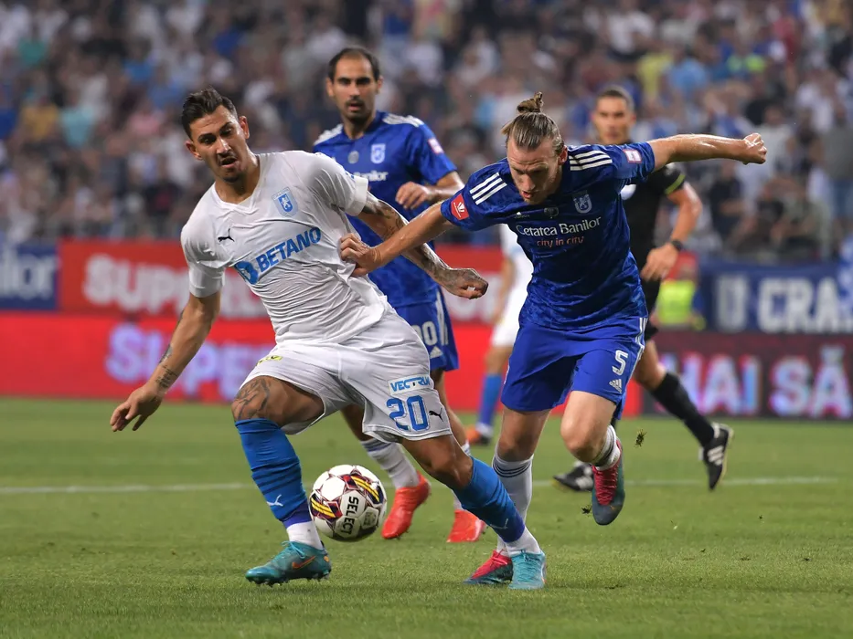 Jovan Markovic si Jeremy Huyghebaert in meciul de fotbal dintre FC U Craiova si Universitatea Craiova, contand pentru Superliga Superbet, desfasurat pe Stadionul Ion Oblemenco din Craiova, duminica 7 august 2022. © FOTO:Razvan Pasarica/SPORT PICTURES