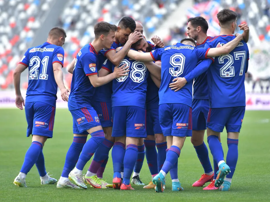 Bucurie a fotbalistilor stelisti dupa un gol marcat cu Stefan Pacionel, Alves Da Silva Walace si Dean Beta in meciul de fotbal dintre Steaua Bucuresti si Concordia Chiajna, contand pentru Play-off-ul Ligii a-2-a Casa Pariurilor, desfasurat pe Stadionul Steaua-Ghencea din Bucuresti, sambata 23 aprilie 2022. © FOTO:Razvan Pasarica/SPORT PICTURES