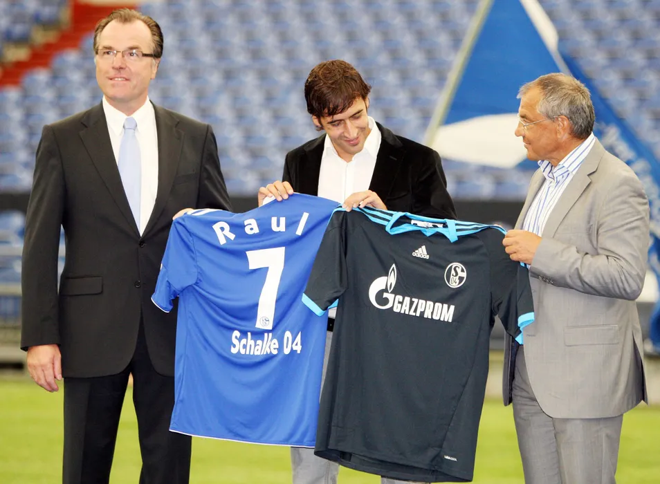 NEUZUGANG RAUL MIT SCHALKES AUFSICHTSRATSVORSITZENDEN CLEMENS TÖNNIES (L) UND TRAINER FELIX MAGATH BEI DER OFFIZIELLEN VORSTELLUNG BEI SCHALKE 04 IN GELSENKIRCHEN