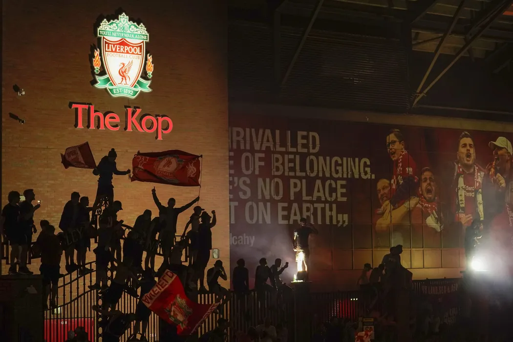 LIVERPOOL, ENGLAND - JUNE 25: Football fans celebrate at Anfield Stadium as Liverpool FC win the Premier League title after Chelsea beat Manchester City tonight ensuring Liverpool FC can no longer be overtaken on points on June 25, 2020 in Liverpool, England. Liverpool have won 18 league championships already with the last title win in 1989-90 under Kenny Dalglish. (Photo by Christopher Furlong/Getty Images)