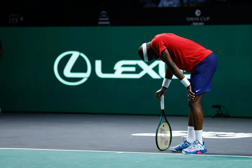 Frances Tiafoe of United States in action against Lorenzo Sonego of Italy during the first tennis match from Davis Cup Finals 2022, Quarter-Finals round, played between Italy and United States USA at Palacio de Deportes Martin Carpena pavilion on november 24, 2022, in Malaga, Spain.