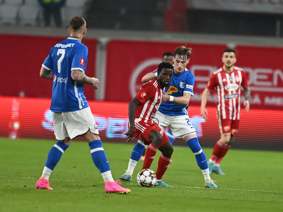 Francisco Santos da Silva Junior si Constantin Grameni in meciul de fotbal dintre Sepsi OSK Sfantu Gheorghe si Farul Constanta, contand pentru Play-off-ul Superligii Superbet, desfasurat pe Sepsi Arena din Sfantu Gheorghe, sambata 29 aprilie 2023. © FOTO:Razvan Pasarica/SPORT PICTURES