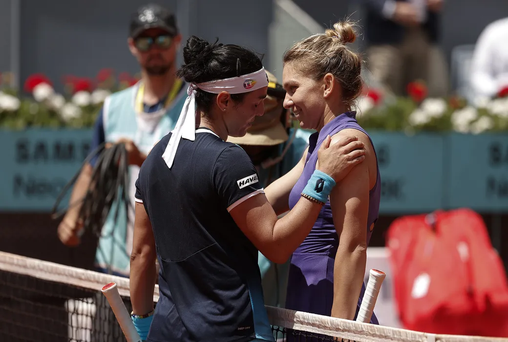 MADRID, SPAIN - MAY 04: Ons Jabeur (L) of Tunisia and Simona Halep (R) of Romania congratulate each other at the end of their quarter-final match during day seven of the Mutua Madrid Open at La Caja Magica on May 04, 2022 in Madrid, Spain. (Photo by Burak Akbulut/Anadolu Agency via Getty Images)