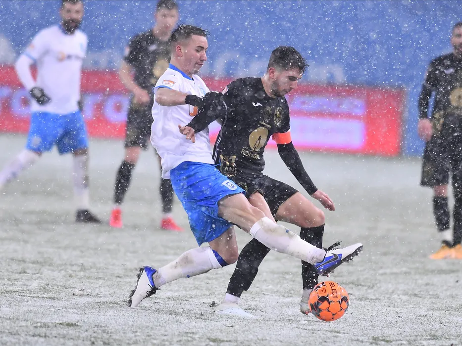 Alexandru Mateiu si Octavian Ronaldo Andrei Deaconu in meciul de fotbal dintre Universitatea Craiova si Gaz Metan Medias, contand pentru Liga 1 Casa Pariurilor, desfasurat fara spectatori pe Stadionul Ion Oblemenco din Craiova, luni 7 decembrie 2020. © FOTO:Razvan Pasarica/SPORT PICTURES