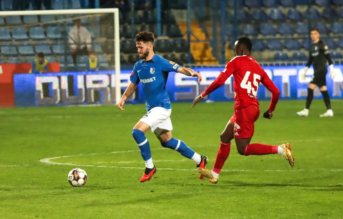 Dan Sîrbu și Essono Fabrice Olinga în meciul de fotbal dintre FC FARUL CONSTANȚA si FC BOTOȘANI, contând pentru SUPERLIGA SUPERBET, desfășurat pe Stadionul central al Academiei Gheorghe Hagi din Ovidiu , duminică 05 noiembrie 2023. © FOTO: Sorin DANIELCIUC/SPORT PICTURES