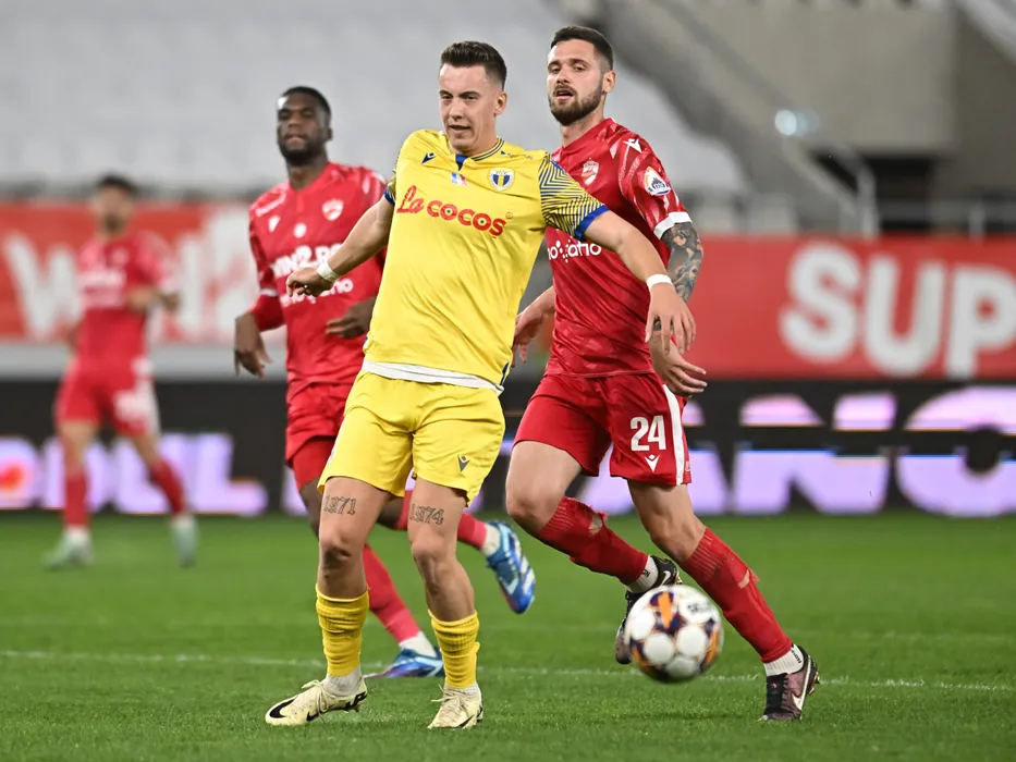 Mihai Alexandru Isfan si Darko Velkovski in meciul de fotbal dintre Dinamo Bucuresti si Petrolul Ploiesti, din cadrul Play out-ului Superligii Superbet, desfasurat pe Stadionul National Arcul de Triumf din Bucuresti, luni 1 aprilie 2024. © FOTO:Razvan Pasarica/SPORT PICTURES