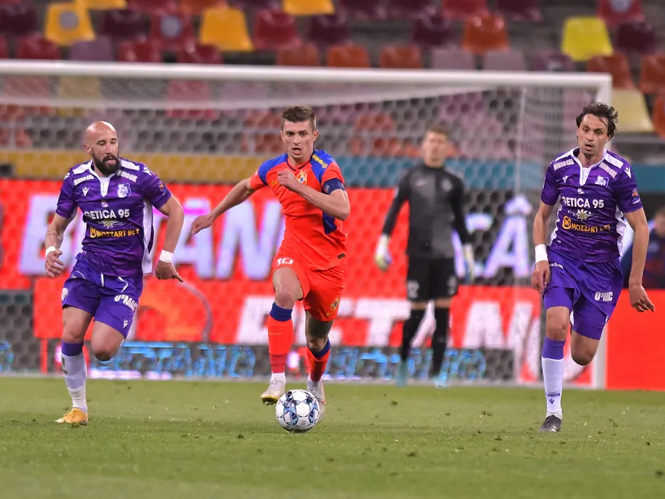 Iasmin Latovlevici, Florin Lucian Tanase si Martin Raynov in meciul de fotbal dintre FCSB si FC Arges, contand pentru Play-off-ul Ligii 1 Casa Pariurilor, desfasurat pe Arena Nationala din Bucuresti, luni 2 mai 2022. © FOTO:Razvan Pasarica/SPORT PICTURES