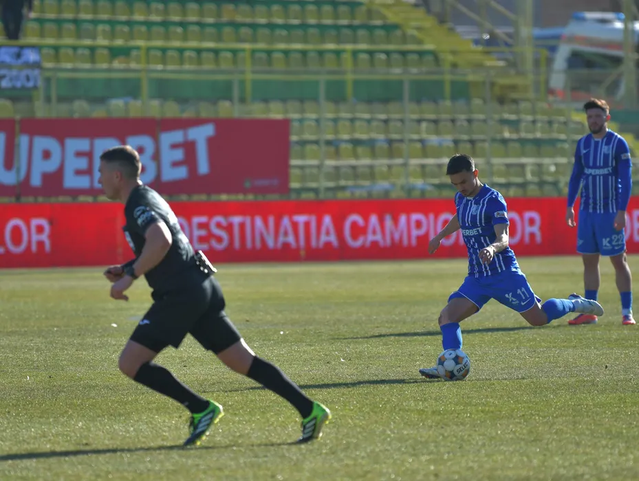 Arbitrul central Istvan Kovacs si Cristian George Ganea in meciul de fotbal dintre FC Arges si FC Farul Constanta, contand pentru Superliga Superbet, desfasurat pe Stadionul Orasenesc din Mioveni, duminica 22 februarie 2026. © FOTO:Mihai Nitoiu/SPORT PICTURES