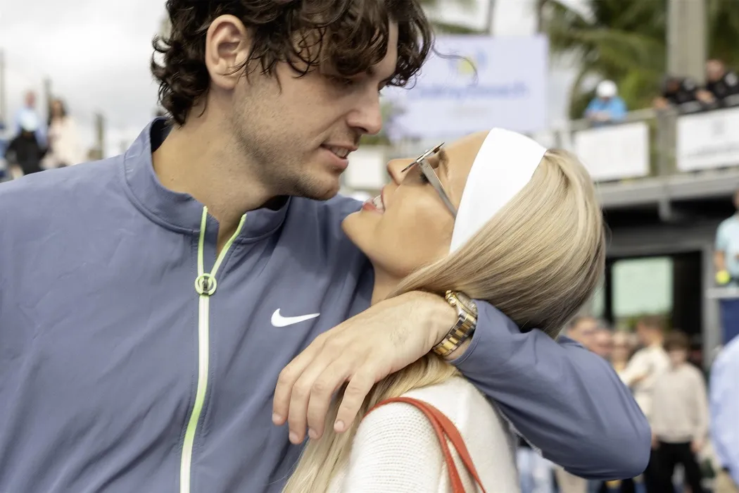 Delray Beach, FL - Morgan Riddle poses with Taylor Fritz (USA) after he wins the 2024 Delray Beach Open at the Delray Beach Tennis Center in Delray Beach, Florida. BACKGRID USA 19 FEBRUARY 2024,Image: 848891579, License: Rights-managed, Restrictions: , Model Release: no, Pictured: Morgan Riddle, Taylor Fritz