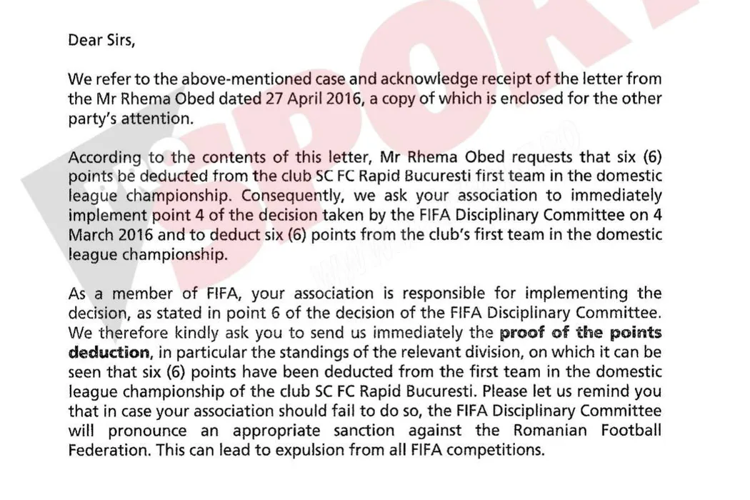 Scapă Rapid de depunctare? UPDATE Obed: „I-am anunțat pe cei de la FIFA că mi s-au virat banii”