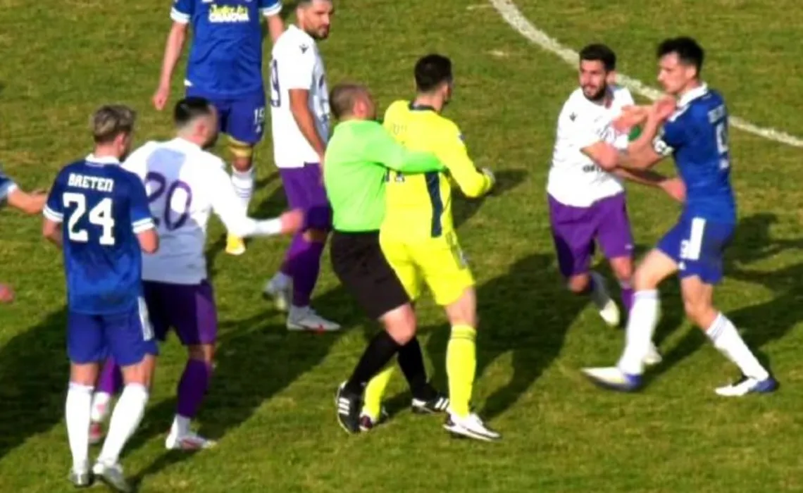 Scene de K1 la meciul amical dintre FC Argeș și FCU Craiova! Jucătorii s-au luat la bătaie la mijlocul terenului. Cum a intervenit arbitrul pentru a opri scandalul | FOTO