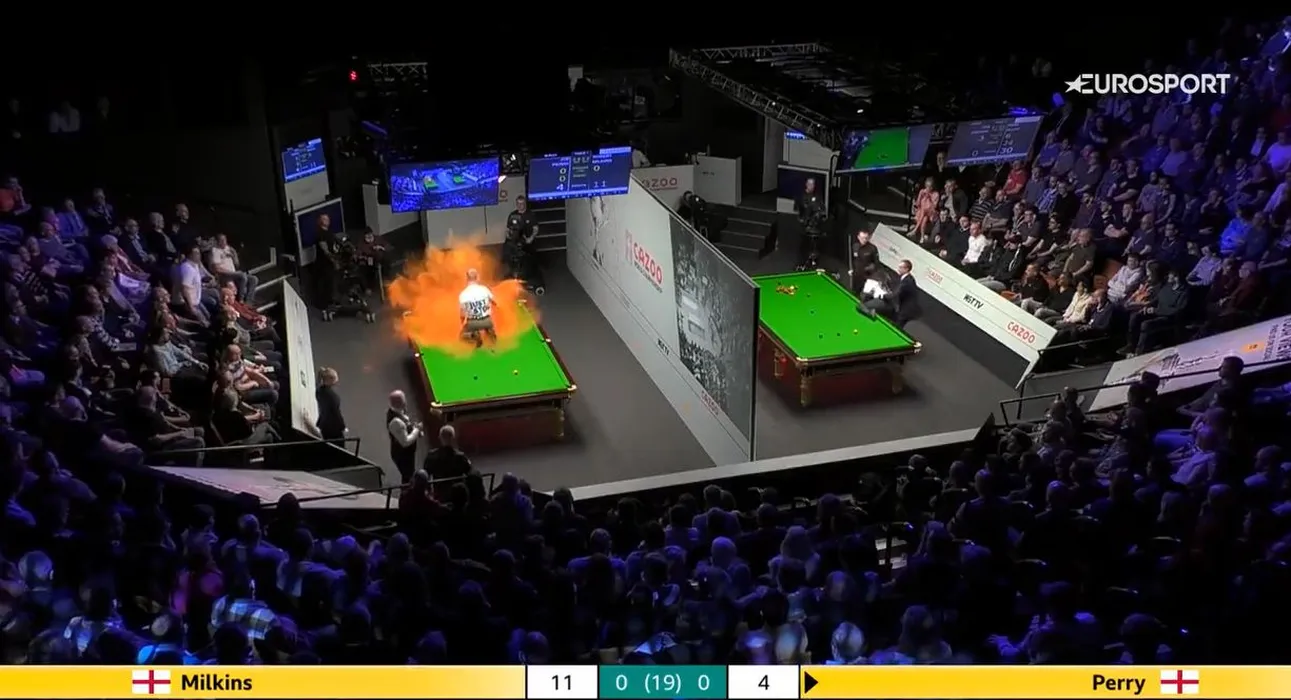 Scene halucinante la Campionatul Mondial de snooker! Așa ceva nu s-a mai întâmplat! Un protestatar s-a urcat pe masă în timpul meciului și a distrus-o după ce a împrăștiat un praf portocaliu! La masa alăturată s-a încercat același gest extrem! VIDEO