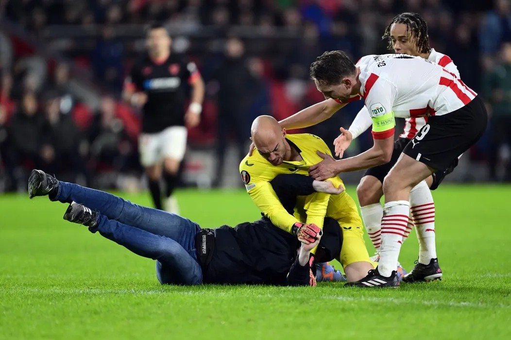 EINDHOVEN - Supporter on the field. (lr) Sevilla FC goalkeeper Marko Dmitrovic, Luuk de Jong or PSV Eindhoven during the UEFA Europa league playoff match between PSV Eindhoven and Sevilla FC at Phillips stadium on February 23, 2023 in Eindhoven, Netherlands.