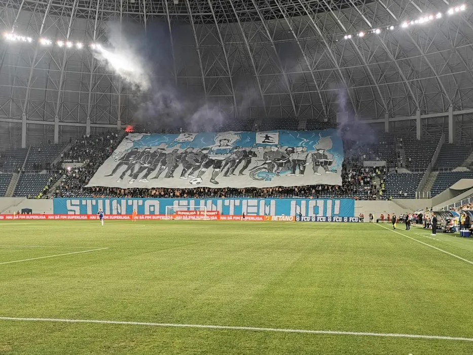 Scenografie atipică în derby-ul Craiovei! Ce banner uriaș au putut să afișeze ultrașii lui FC U | GALERIE FOTO
