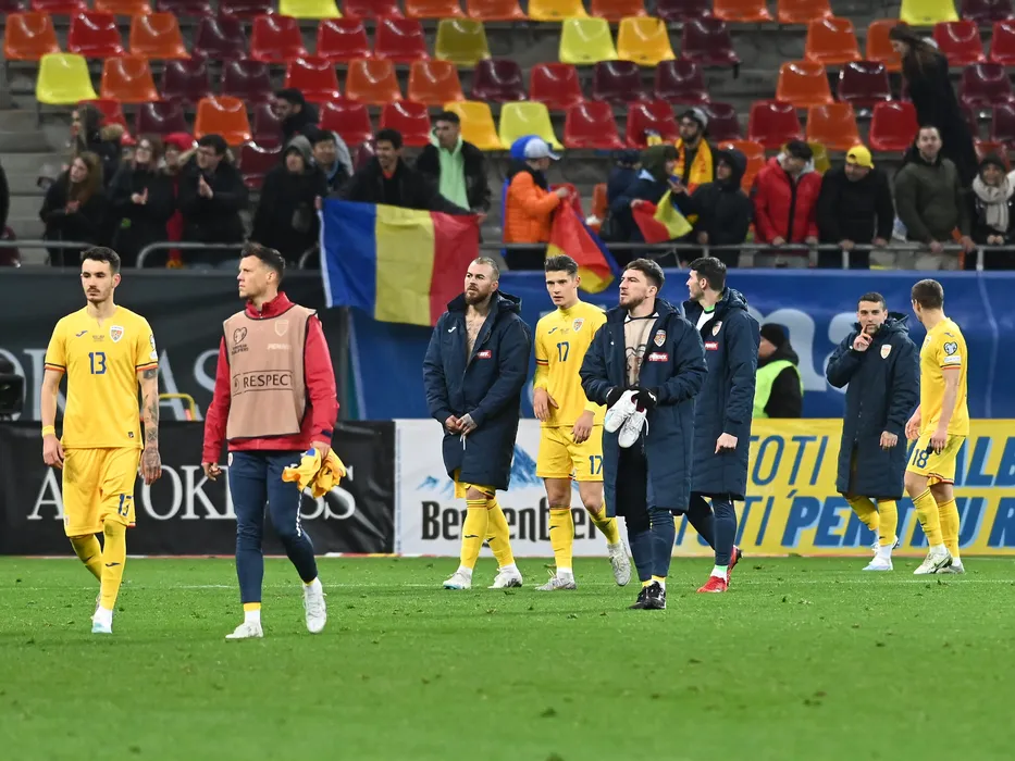Fotbalistii romani Raul Oprut, Adrian Rus, Denis Alibec, Alexandru Mihai Dobre, Deian Sorescu si Nicolae Stanciu parasesc terenul dupa meciul de fotbal dintre Romania si Belarus, din cadrul preliminariilor Campionatului European 2024, desfasurat pe Arena Nationala, marti 28 martie 2023. © FOTO:Razvan Pasarica/SPORT PICTURES