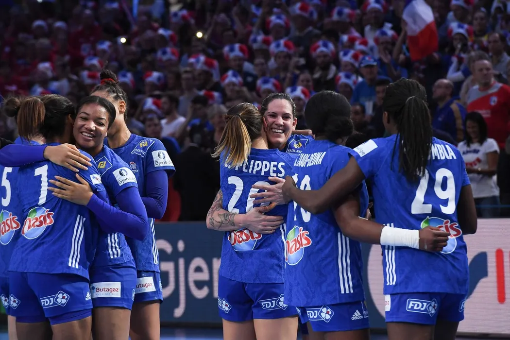 Alexandra Lacrabere and Laura Flippes of French team. Victory of French team Gold medal of Euro 2018 EHF final match Women's handball at the AccorHotel Arena in Paris on December 16, 2018 between the French team and the Russia team. Paris, FRANCE - 16/12/2018//HARSIN_HANDBALLEUROFRANCERUSSIE050/Credit:ISA HARSIN/SIPA/1812162134,Image: 403027373, License: Rights-managed, Restrictions: , Model Release: no, Credit line: Profimedia