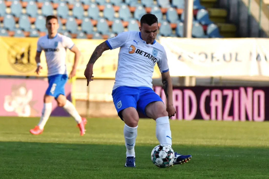 Dan Nistor, de la Universitatea Craiova, suteaza in timpul meciului de fotbal contra echipei FC Botosani din etapa a doua a play-off-ului Ligii 1, disputat pe stadionul Municipal din Botosani, miercuri, 21 aprilie 2021. DRAGOS PASCANEANU / MEDIAFAX FOTO