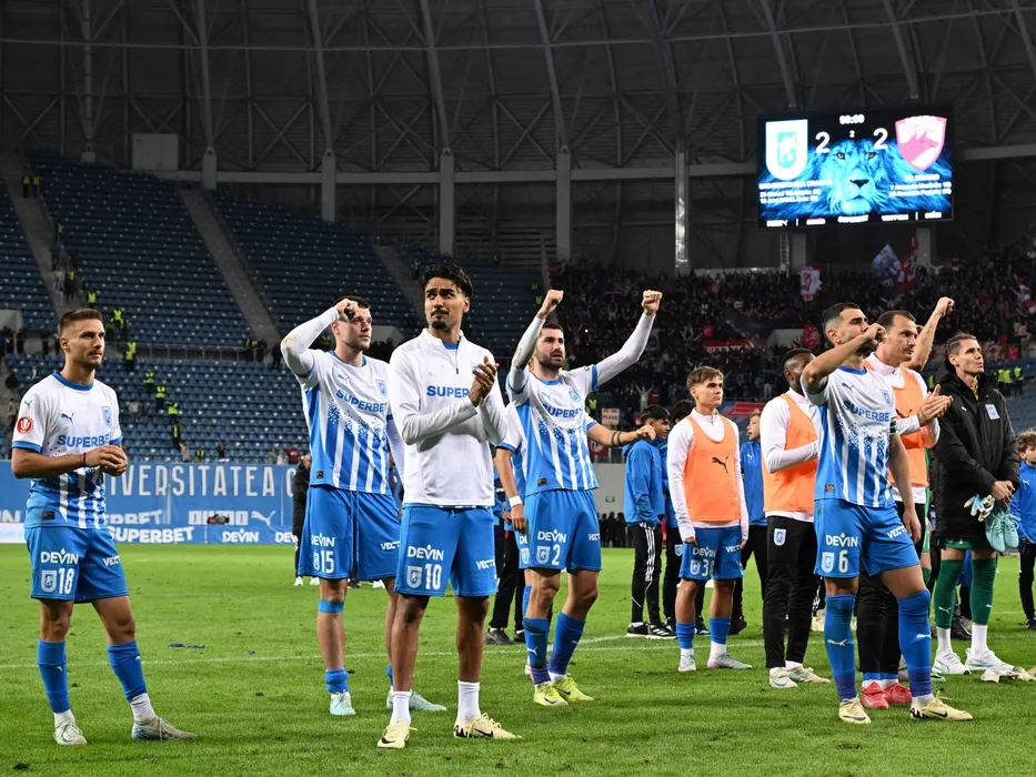Fotbalistii craioveni Mihnea Gabriel Radulescu, Juraj Badelj, Stefan Baiaram, Florin Bogdan Stefan, David Matei, Screciu Vladimir Ionuț, Vasile Mogos si Silviu Lung Jr. saluta galeria alături de tabela de marcaj dupa meciul dintre Universitatea Craiova si Dinamo Bucuresti, contand pentru Superliga Superbet, desfasurat pe Stadionul Ion Oblemenco din Craiova, vineri 26 septembrie 2025. © FOTO:Razvan Pasarica/SPORT PICTURES
