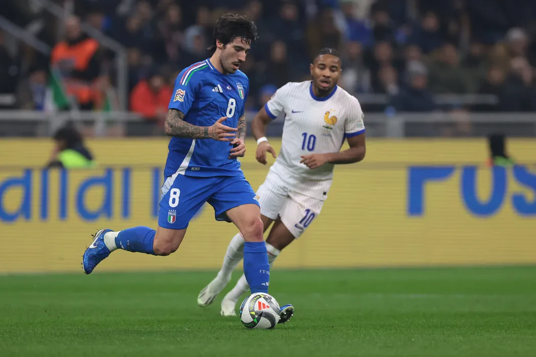 17 November 2024, Italy, Milan: Italy's Sandro Tonali (L) and France's Christopher Nkunku battle for the ball, during the UEFA Nations League Group A2 soccer match between Italy and France at the San Siro Stadium. Photo: Jonathan Moscrop/CSM via ZUMA Press Wire/dpa