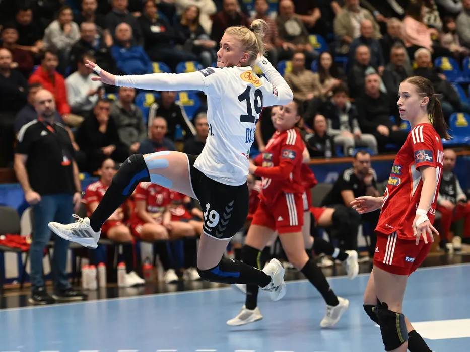 Daniela De Jong si Anikó Kovacs in meciul de handbal feminin dintre SCM Ramnicu Valcea si Praktiker Vac, contand pentru EHF European League, desfasurat in Sala Traian din Ramnicu Valcea, duminica 8 ianuarie 2023. © FOTO:Razvan Pasarica/SPORT PICTURES
