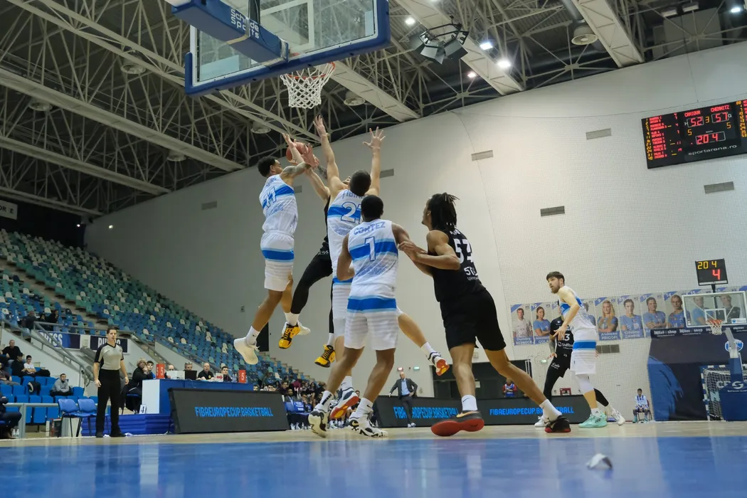 Shawn Hopkins si Bogdan Tibirna in meciul de baschet masculin dintre echipele SCM U Craiova ( echipament alb albastru ) - Niners Chemnitz ( echipament negru ) etapa 6 din FIBA Europe Cup disputat la Sala Polivalenta din Craiova miercuri 08 februarie 2023 . REMUS BADEA / MEDIAFAX FOTO