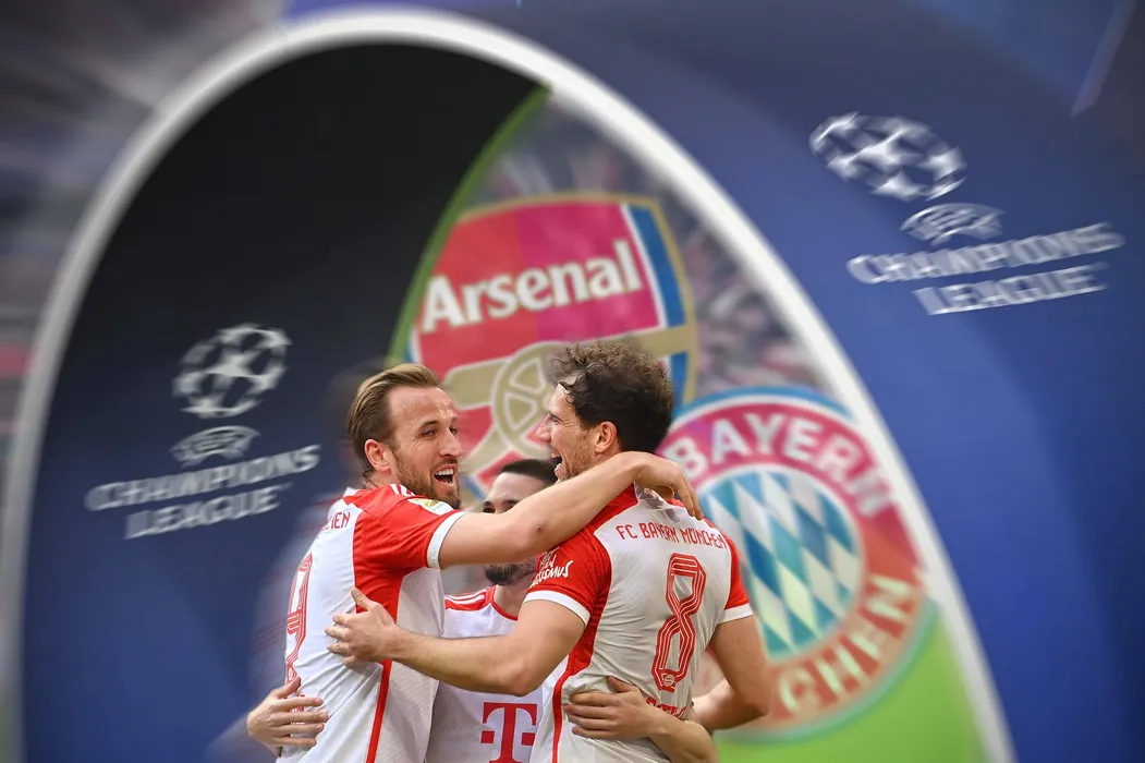 FOTOMONTAGE: Vorschau zum Champions League Viertelfinale FC Bayern Muenchen - FC Arsenal. ARCHIVFOTO Der FC Bayern Muenchen trifft auf Arsenal London. Jubel mit Harry KANE Bayern Muenchen, Raphael GUERREIRO Bayern Muenchen und Leon GORETZKA Bayern Muenchen. *** PHOTOMONTAGE Preview of the Champions League quarter-final FC Bayern Muenchen FC Arsenal ARCHIVE PHOTO FC Bayern Muenchen meets Arsenal London Cheers with Harry KANE Bayern Muenchen , Raphael GUERREIRO Bayern Muenchen and Leon GORETZKA Bayern Muenchen,Image: 857082841, License: Rights-managed, Restrictions: Credit images as "Profimedia/ IMAGO", Model Release: no