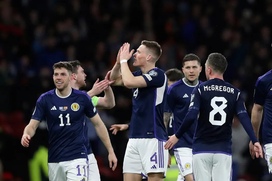 Scotland's Scott McTominay, third from left, celebrates with his teammates after scoring his side's second goal during the Euro 2024 group A qualifying soccer match between Scotland and Spain at the Hampden Park stadium in Glasgow, Scotland, Tuesday, March 28, 2023.,Image: 765757634, License: Rights-managed, Restrictions: This content is intended for editorial use only. For other uses, additional clearances may be required., Model Release: no, Pictured: Scott McTominay