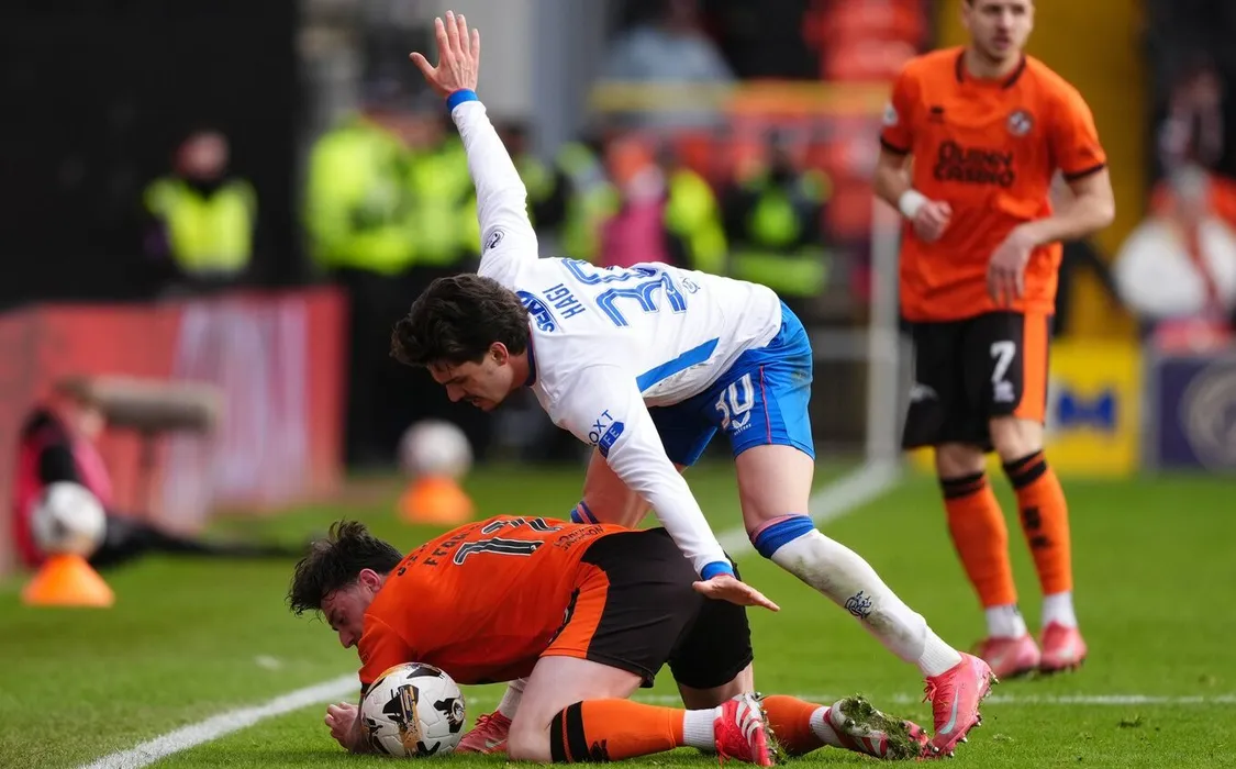 Ianis Hagi, în duel cu Will Ferry în meciul Dundee - Glasgow Rangers. FOTO: Profimedia 26.01.2025
