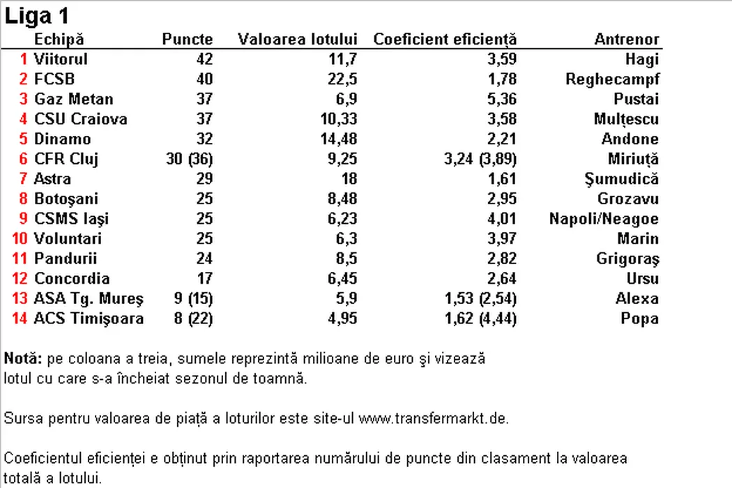 Scumpi degeaba. Reghecampf – FCSB și Șumudică – Astra, antrenorii cu cele mai slabe rezultate comparativ cu valoarea lotului. Clasamentul eficienței în Liga 1, condus de Pustai, care are lot de locul 9 și a terminat anul pe 3