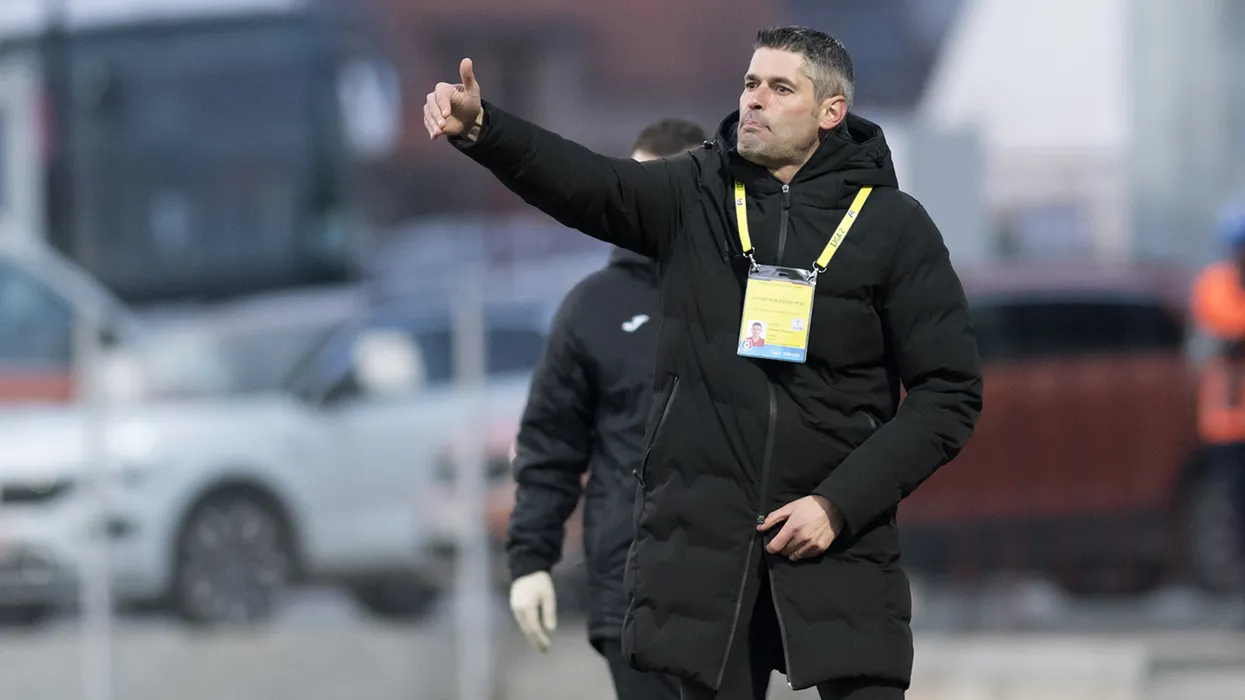 Valentin Suciu, antrenorul principal al echipei FK Csikszereda, reactioneaza in timpul meciului de fotbal dintre echipele FK Csikszereda Miercurea Ciuc si Rapid Bucuresti, contand pentru prima etapa a play-off-ului Ligii a II-a, disputat pe stadionul Municipal din Miercurea Ciuc, marti, 6 aprilie 2021. Leczki Jozsi/Mediafax Foto