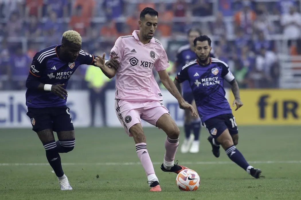 SURSA FOTO: PROFIMEDIA. Aaron Boupendza și Sergio Busquets în timpul unui duel Cincinnati - Inter Miami
