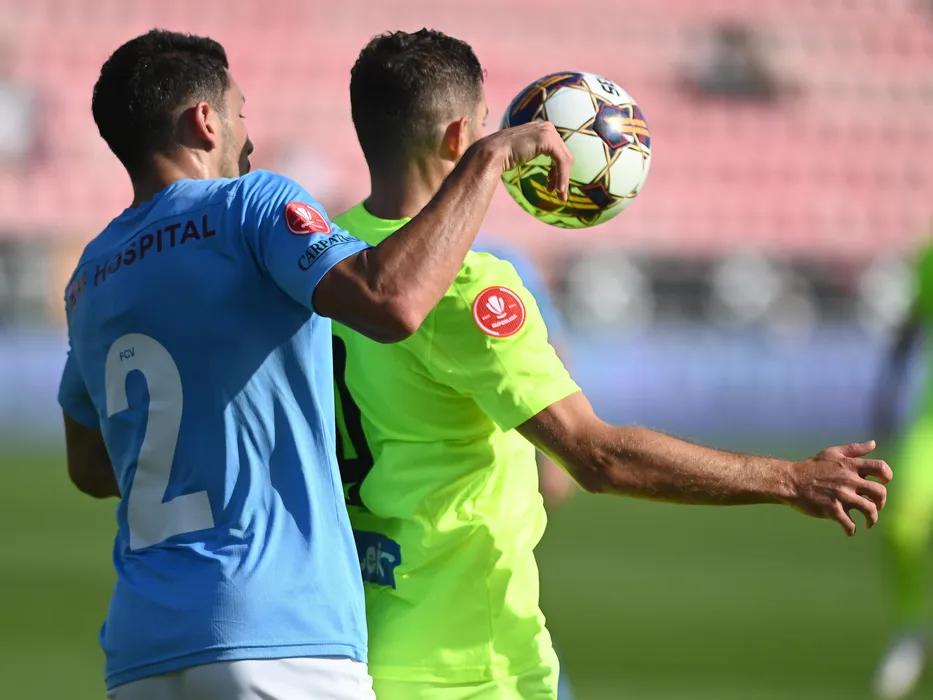 Cristian Ignacio Paz si Sergiu Florin Bus in meciul de fotbal dintre FC Voluntari si Politehnica Iasi, din cadrul Superligii Superbet, desfasurat pe Stadionul Anghel Iordanescu din Voluntari, sambata 23 septembrie 2023. © FOTO:Razvan Pasarica/SPORT PICTURES