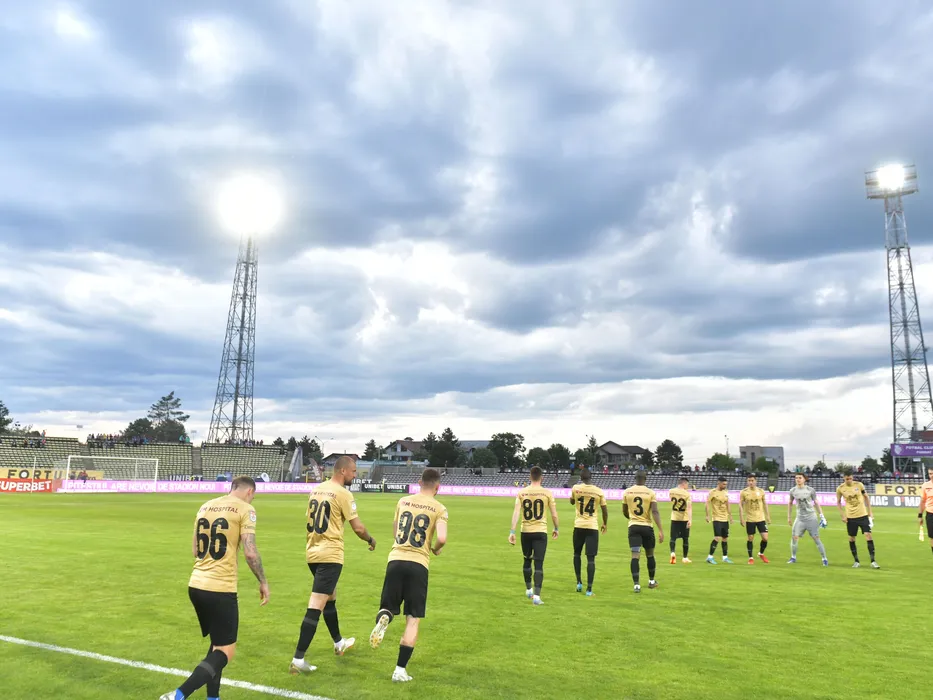 Fotbalistii voluntareni cu cerul inourat deasupra la startul meciului de fotbal dintre FC Arges si FC Voluntari, contand pentru Play-off-ul Ligii 1 Casa Pariurilor, desfasurat pe Stadionul Nicolae Dobrin din Pitesti, luni 23 mai 2022. © FOTO:Razvan Pasarica/SPORT PICTURES