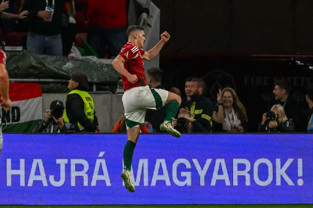 11 October 2024, Hungary, Budapest: Hungary's Roland Sallai celebrates scoring his side's first goal during the UEFA Nations League A Group C soccer match between Hungary and Netherlands at the Puskas Arena stadium. Photo: Vincenzo Orlando/Ipa Sport / Ipa/LiveMedia/IPA/dpa