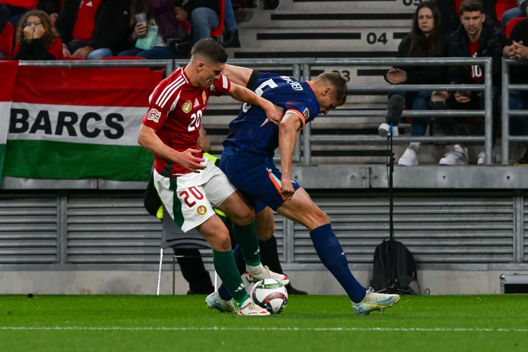 11 October 2024, Hungary, Budapest: Hungary's Roland Sallai and Netherlands' Micky van de Ven battle for the ball during the UEFA Nations League A Group C soccer match between Hungary and Netherlands at the Puskas Arena stadium. Photo: Vincenzo Orlando/Ipa Sport / Ipa/LiveMedia/IPA/dpa