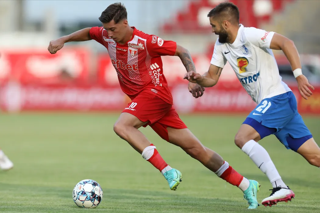 David Miculescu (S), de la UTA Arad, lupta pentru balon cu Alin Dobrosavlevici (D), de la Farul Constanta in meciul de fotbal din prima etapa a Ligii 1, disputat pe stadionul Francisc Neuman din Arad, duminica, 18 iulie 2021. CIPRIAN PETCUT / MEDIAFAX FOTO