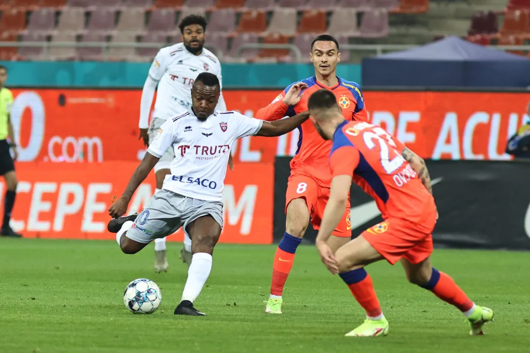 Hervin Ongenda (S), de la FC Botosani, suteaza in timpul meciului de fotbal contra echipei FCSB din etapa a XVI-a a Ligii 1, disputat pe Arena Nationala din Bucuresti, duminica, 21 noiembrie 2021. GEORGE FILIP / MEDIAFAX FOTO