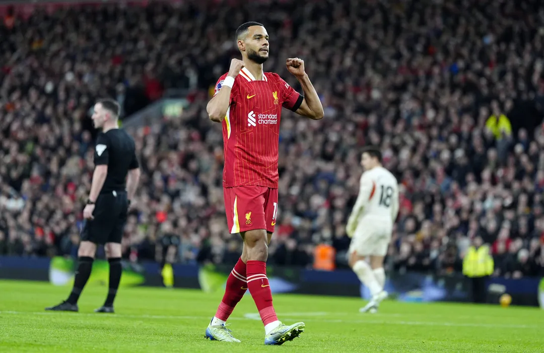01 December 2024, United Kingdom, Liverpool: Liverpool's Cody Gakpo celebrates scoring his side's first goal during the English Premier League soccer match between Liverpool and Manchester City at Anfield. Photo: Peter Byrne/PA Wire/dpa