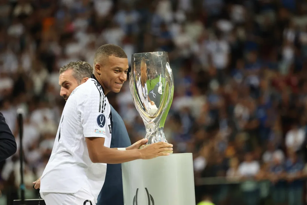 14 August 2024, Poland, Warsaw: Real Madrid's Kylian Mbappe celebrates with the trophy at the award ceremony following the UEFA Super Cup 2024 match between Real Madrid CF and Atalanta BC at the national stadium. Photo: Fabio Sasso/ZUMA Press Wire/dpa